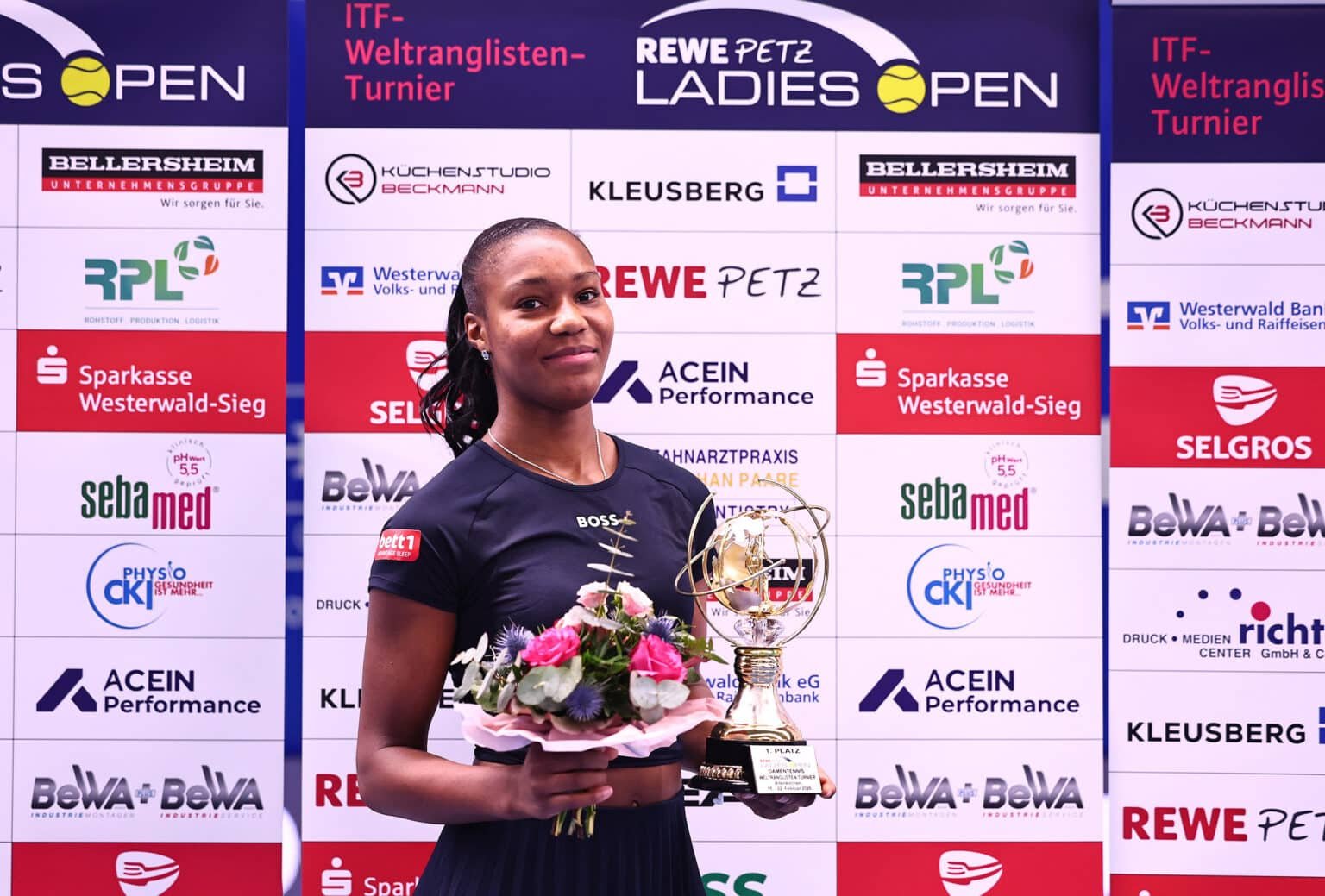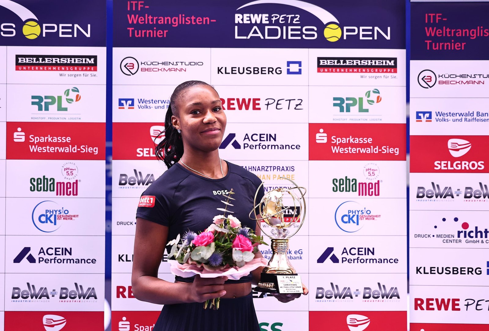 Im Einzelfinale der Rewe Petz Ladies Open endete die Serie von Julia Avdeeva, die nach zwei Turniersiegen auf der Glockenspitze in den vergangenen beiden Jahren auf dem Weg ins Endspiel auch ihre Matches Nummer 11 bis 14 für sich entschied. Am Sonntag war Noma Noha Akugue obenauf, die mit 6:2, 6:1 gewann und sich den Titel sicherte. „Ich wollte es heute genießen und Spaß haben“, strahlte die Hamburgerin bei der Siegerehrung. Nach 64 Minuten Spielzeit herrschte bei ihr tatsächlich beste Laune, als Turnierdirektor Razvan Mihai der Nummer fünf der Setzliste den Siegerpokal überreichte. Avdeeva war spürbar gehandicapt, hatte Probleme mit dem rechten Schlagarm. „Ich konnte heute nicht mein bestes Tennis spielen. Aber darüber möchte ich nicht reden. Das ist keine Ausrede für das Ergebnis“, sagte die entthronten Vorjahressiegerin.