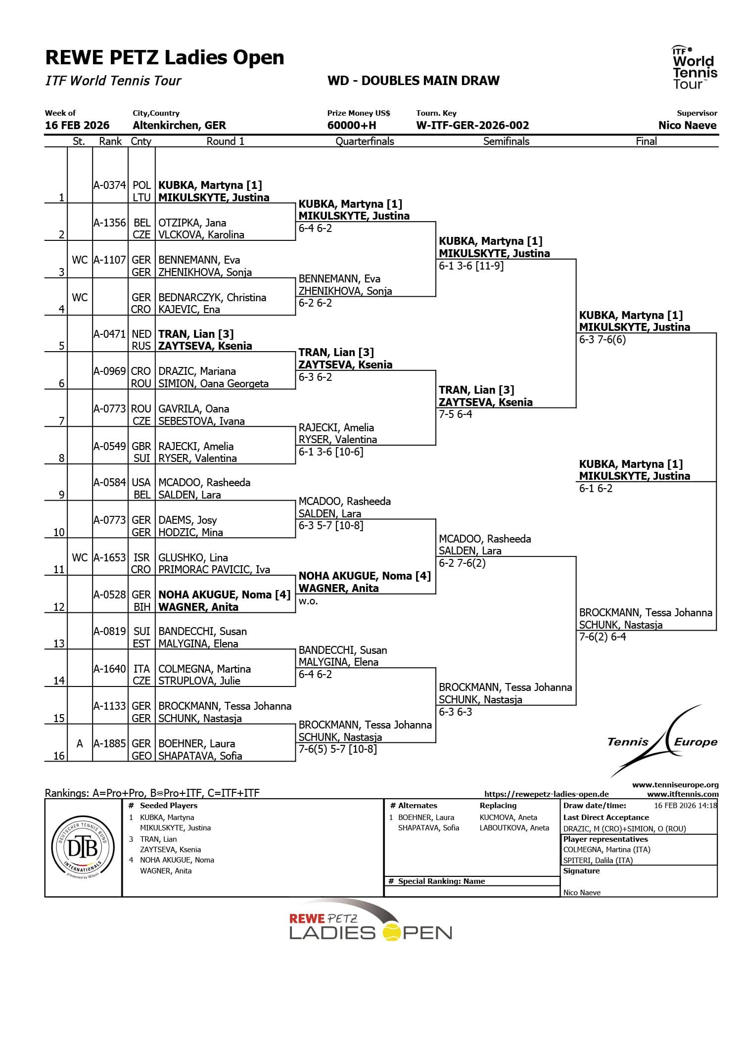 Im insgesamt einseitigen Endspiel machte die litauisch/polnische Kombination – auch sie war erstmals als Doppel Seite an Seite unterwegs – die meisten der Schlüsselpunkte. Vielleicht fehlte es der jungen deutschen Paarung in den wichtigen Momenten auch noch etwas an der Erfahrung. Zwei Breaks von Mikulskyte und Kubka führten im ersten Durchgang zum deutlichen 6:1. Im zweiten Satz hatten die von Bundestrainer Torben Beltz betreuten DTB-Talente ihre Chancen, nutzten sie aber nicht – so beim Breakball zum möglichen 2:0 und beim Spielverlust zum 2:4-Rückstand nach 40:0-Führung.