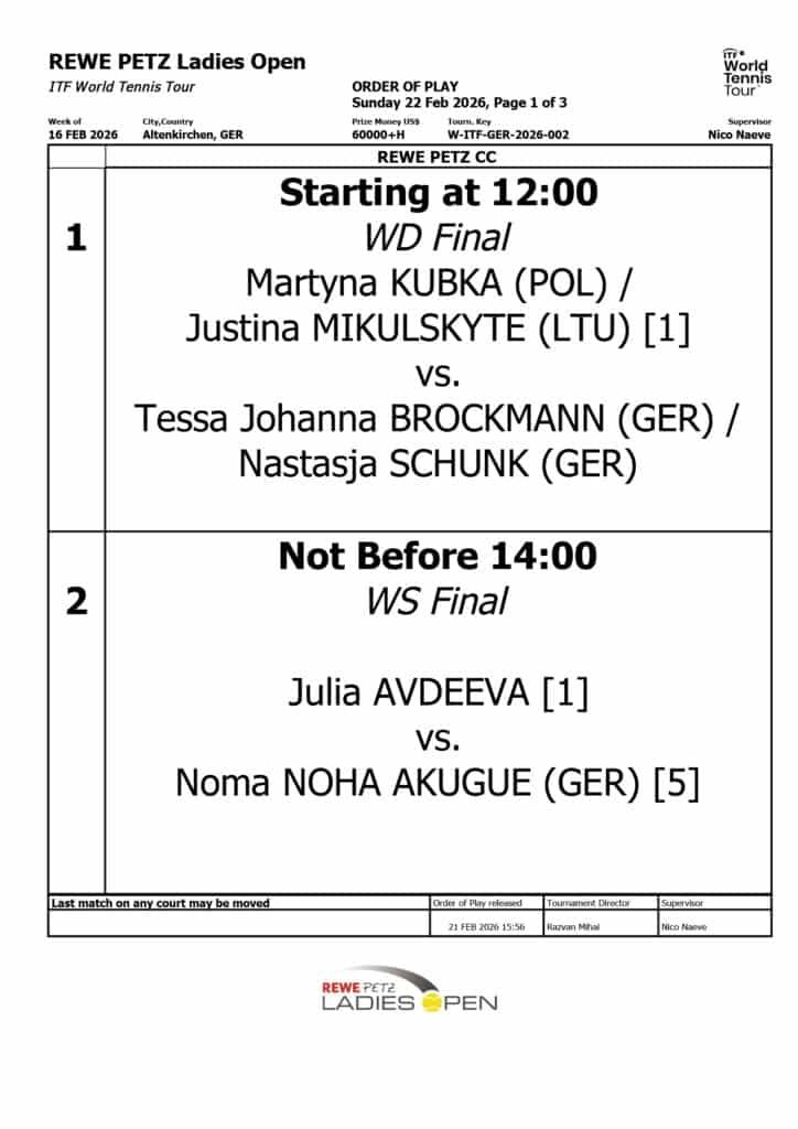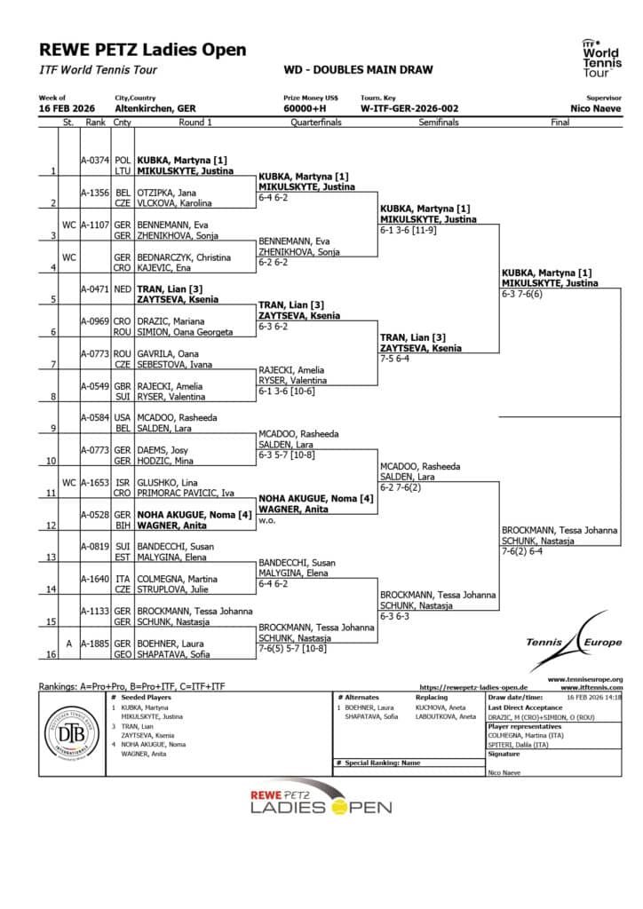 Das Doppel-Endspiel bestreiten Tessa Brockmann und Nastasja Schunk gegen die topgesetzten Martyna Kubka und Justina Mikulskyte. Somit kommt Kubka auch noch zu ihrem Endspiel.