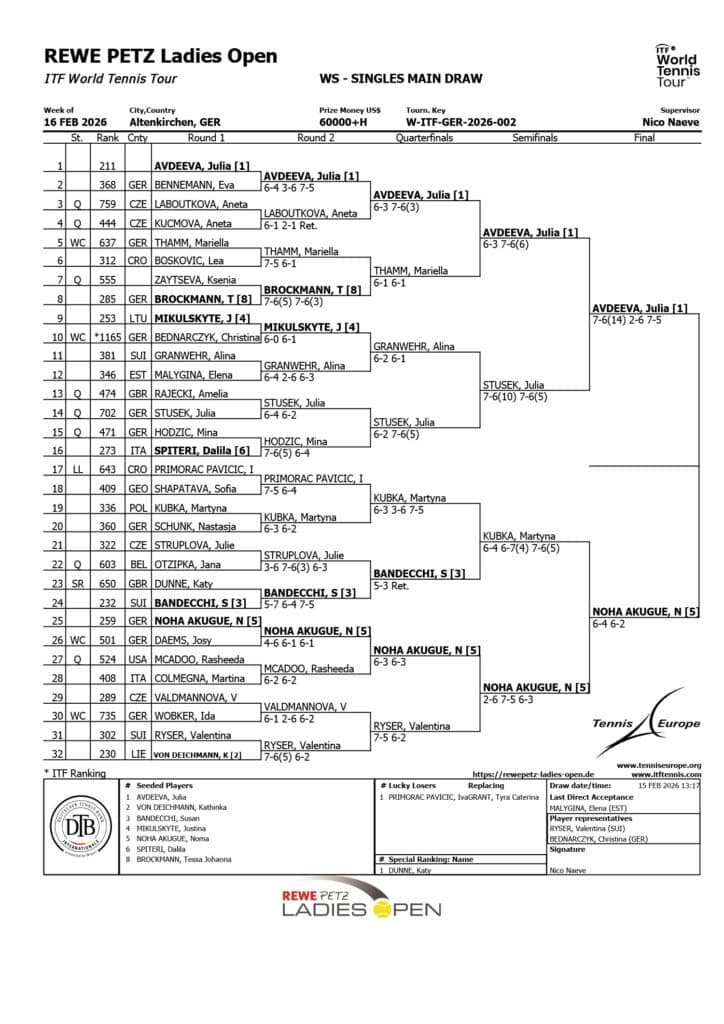 Die Rewe Petz Ladies Open gehen am Sonntag auf der Altenkirchener Glockenspitze in ihren Finaltag. Ab 12 Uhr geht‘s auf dem Rewe Petz Center Court um den Doppeltitel, im Anschluss daran (nicht vor 14 Uhr) kann Julia Avdeeva Geschichte schreiben. Die 23-jährige Russin will sich zum dritten Mal in Folge die 75 Weltranglistenpunkte sichern. Ihr gegenüber steht Noma Noha Akugue, die die dritte deutsche Siegerin nach Carina Witthöft und Eva Lys werden kann. Die Hamburgerin gewann in zwei Sätzen mit 6:4 und 6:2 gegen Martyna Kubka aus Polen, der nach dem Drei-Stunden-Kraftakt im Viertelfinale gegen Susan Bandecchi und durch die Belastung im Doppel auch ein wenig die Frische fehlte, die vielleicht notwendig gewesen wäre, um den Schritt ins Finale zu gehen.