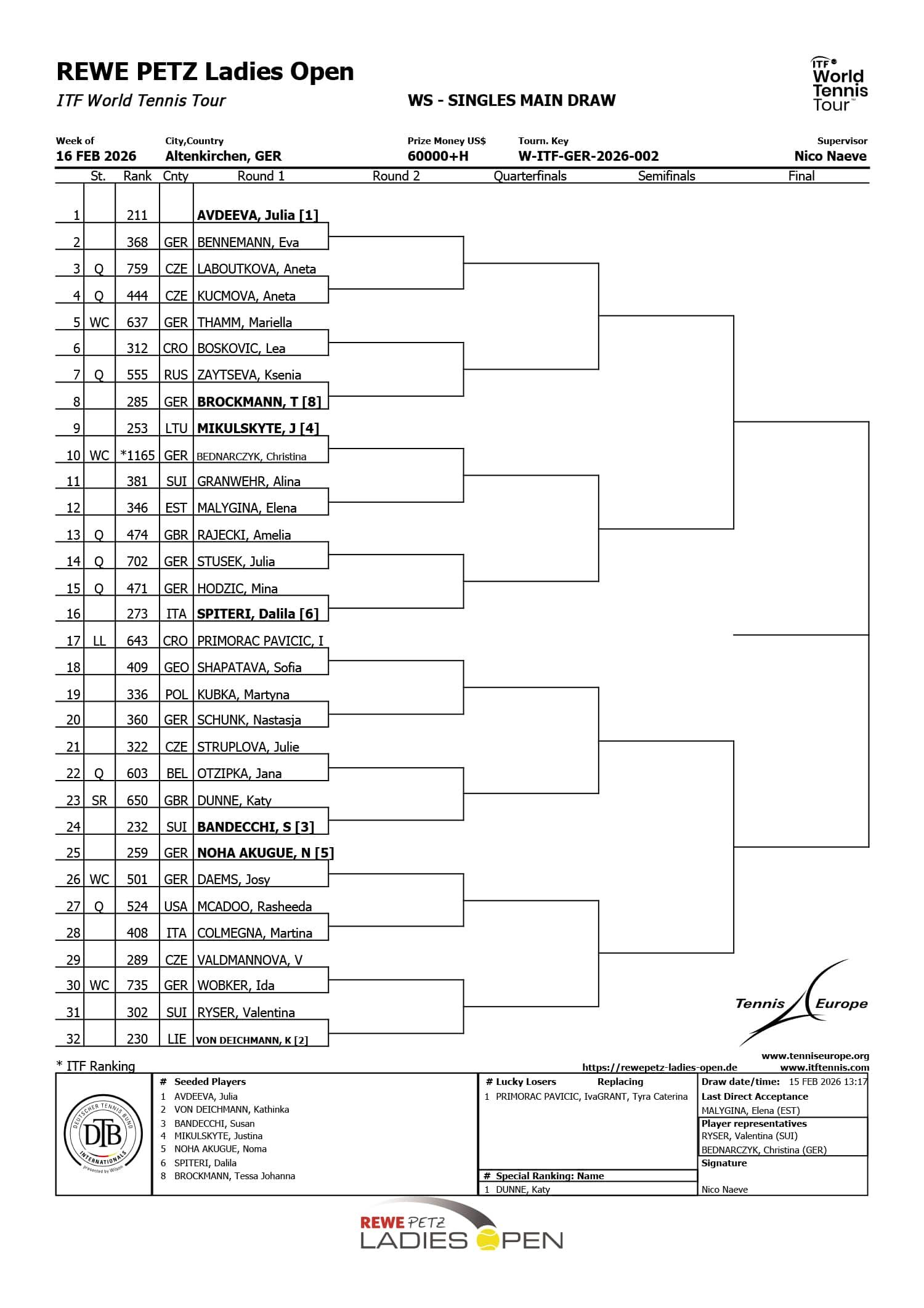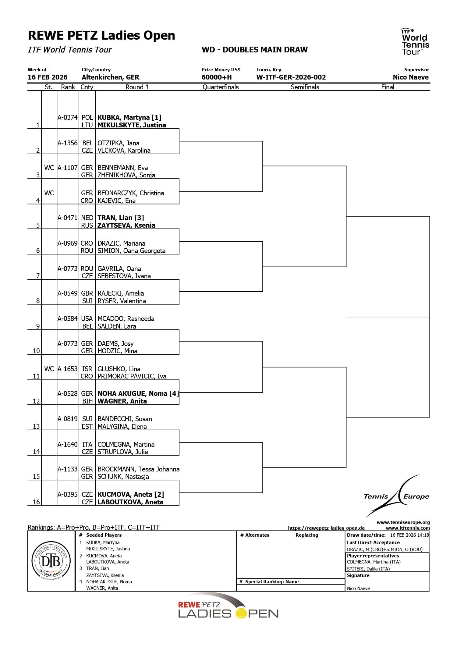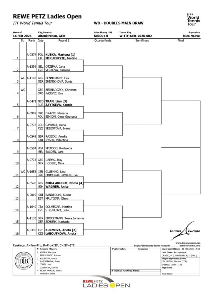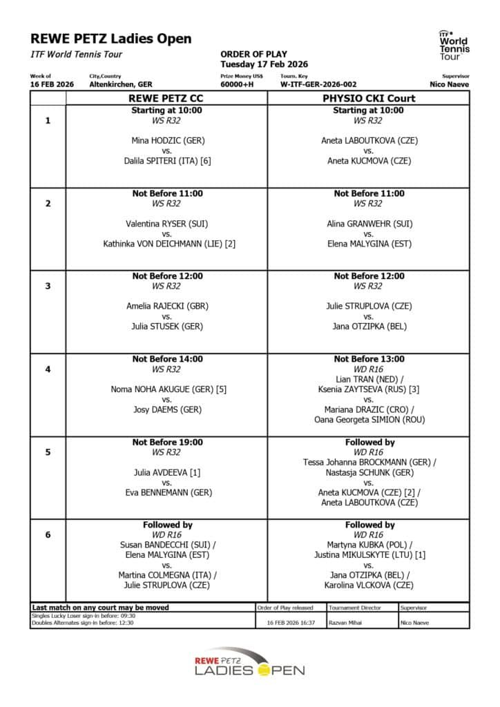 Spielplan 2026 Spiele am 17. Februar PDF Anzeigen Einzel Turnierbaum Einzel Turnierbaum PDF Anzeigen Doppel Turnierbaum Doppel Turnierbaum PDF Anzeigen Zum Spielplan Über den ITF Verband werden die Spielpläne präsentiert.Einfach auf den Link klicken